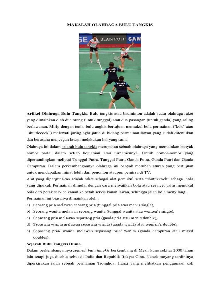 Contoh makalah olahraga bulu tangkis. Bulu tangkis bertujuan memukul bola permainan (kok/shuttlecock. Bulu tangkis bulu tangkis adalah salah satu olahraga yang terkenal di dunia. Contoh makalah apa saja yang kamu tahu? Dengan membuat makalah, siswa atau mahasiswa akan berlatih menganalisis dan memecahkan masalah terhadap suatu masalah.